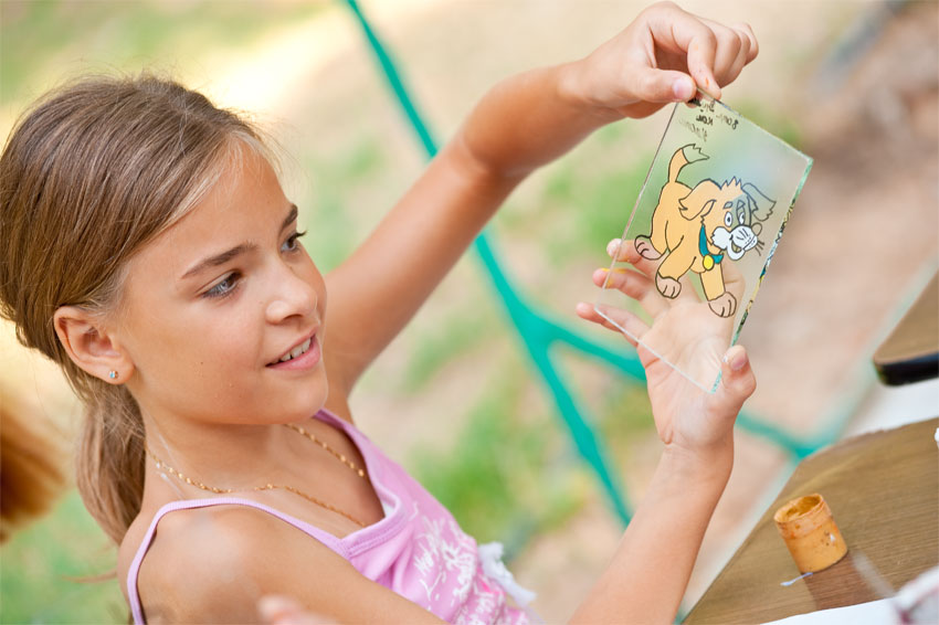 Это очень увлекательный процесс: сначала нужно выбрать картинку, перерисовать ее тушью на стекло, а потом раскрасить получившийся рисунок яркими цветами, что требует аккуратности и сосредоточенности. Так что, ожидая ребенка из лагеря, не забудьте подготовить место для его шедевра, а может даже и не одного.